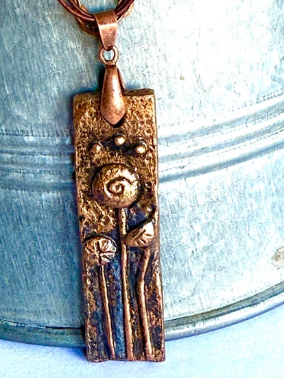 Turquoise glass wrapped with antique copper colored wire. Three piece set - necklace, bracelet and earrings.