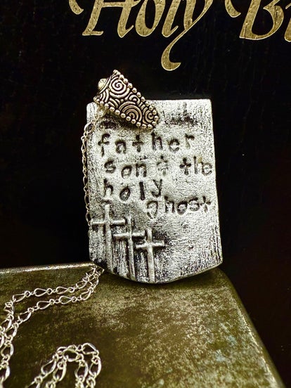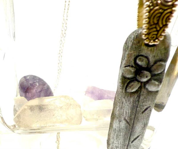 2 1/4" original design hand-carved silver ceramic pendent with silver bail, 2 Amethyst beads, 2 small purple pearls, 1 tiny grey pearl and 4 silver colored accent beads on 15" fine sterling silver chain.