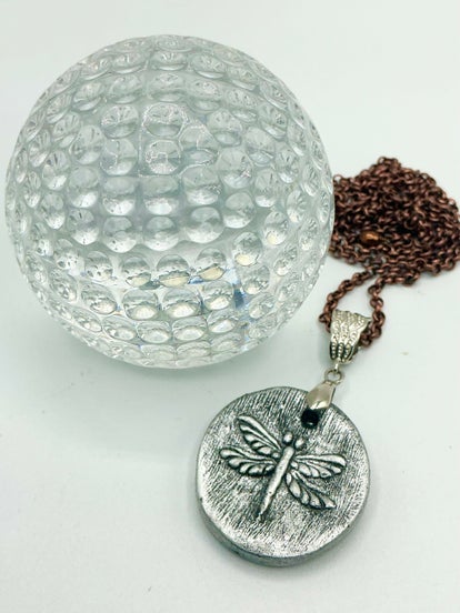 1 3/4" "How Great Thou Art" inspirational words silver hand-carved ceramic pendent. Copper bail on 12 1/2: contuous copper colored chain and 1 small Amber gemstone bead.