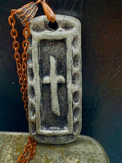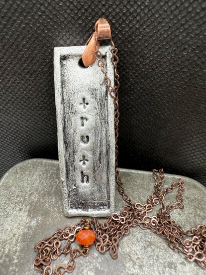 1 3/4" "My Savior God To Thee" inspirational words silver hand-carved ceramic pendent. Copper bail on 16" contuous copper colored chain and 1 small amber fire polished glass bead.