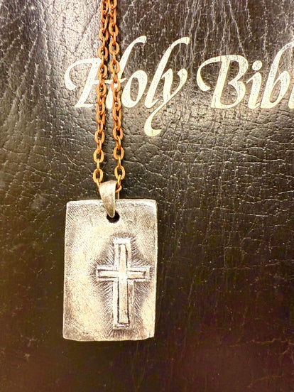 1 3/4" Hand-carved original design ceramic Christian cross pendent - silver with 14 3/4" continuous copper colored chain, a copper bail and one copper colored bead.