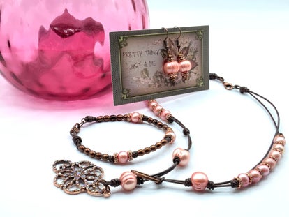 1 3/4" "Pisces" hand-carved silver Zodiac pendent on 14 1/2" continuous copper colored chain with a silver bail, 2 silver heishi beads and 1 large hemitite bead.
